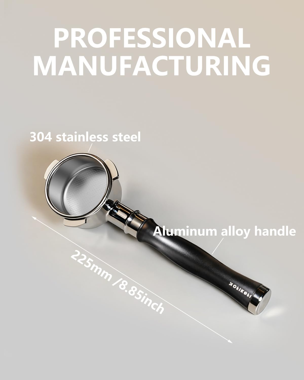 The construction is described as 304 stainless steel for the handle head and 304 stainless steel puck screen, with an anodized body finish. In practical terms, that suggests a more durable, more premium-feeling accessory than the cheapest generic alternatives. The included two-cup basket can also be replaced with a basket of different depth, which gives you some flexibility if you later want to tune dose and headspace.