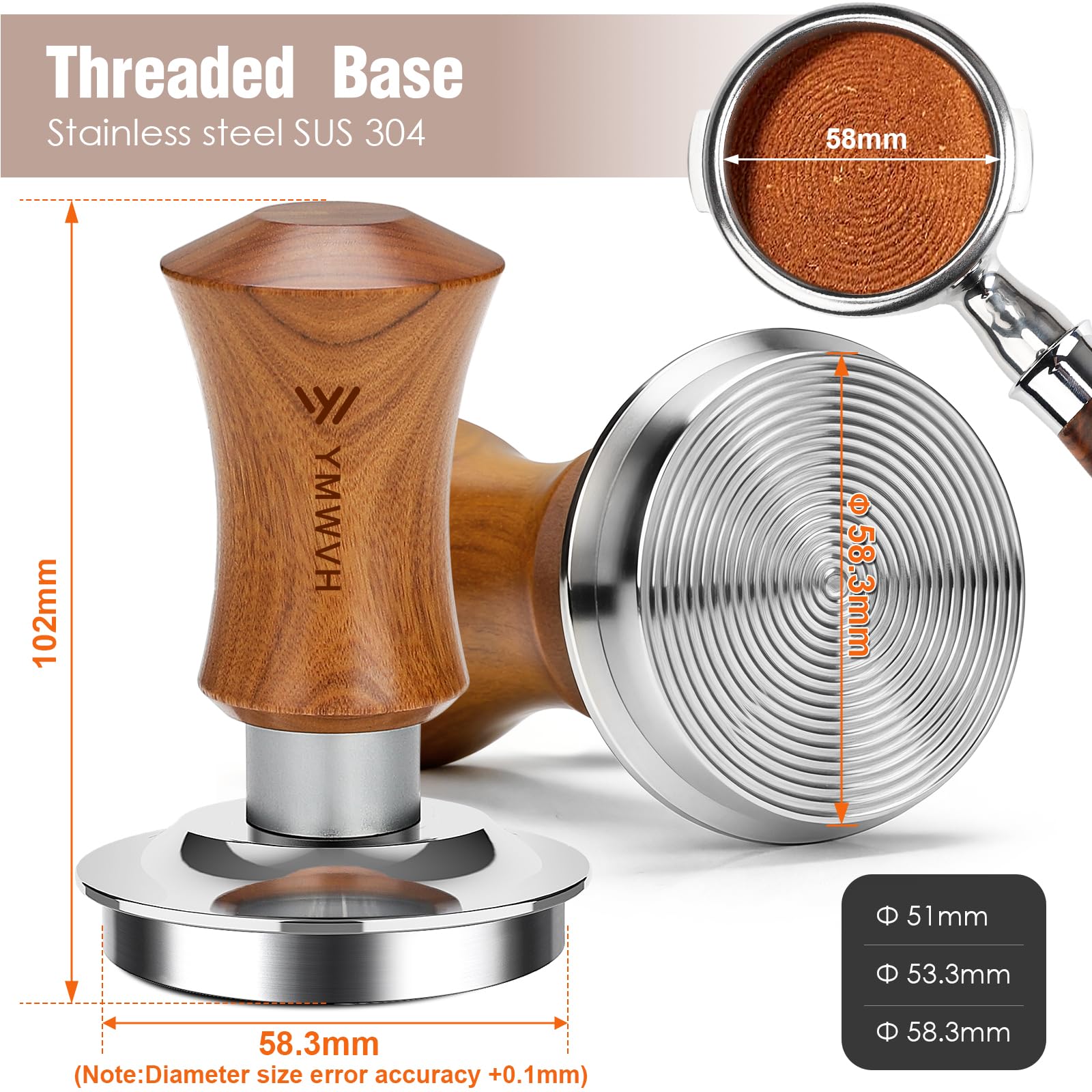 The materials are straightforward and sensible: food-safe stainless steel for the tamping base and a walnut-wood handle for comfort. Stainless steel is the right call for a part that will see constant contact with coffee grounds and moisture, while the walnut handle should make it more pleasant to hold than an all-metal tamper. The listing also positions it as comfortable for extended use, which is exactly what you want if you make multiple shots a day.