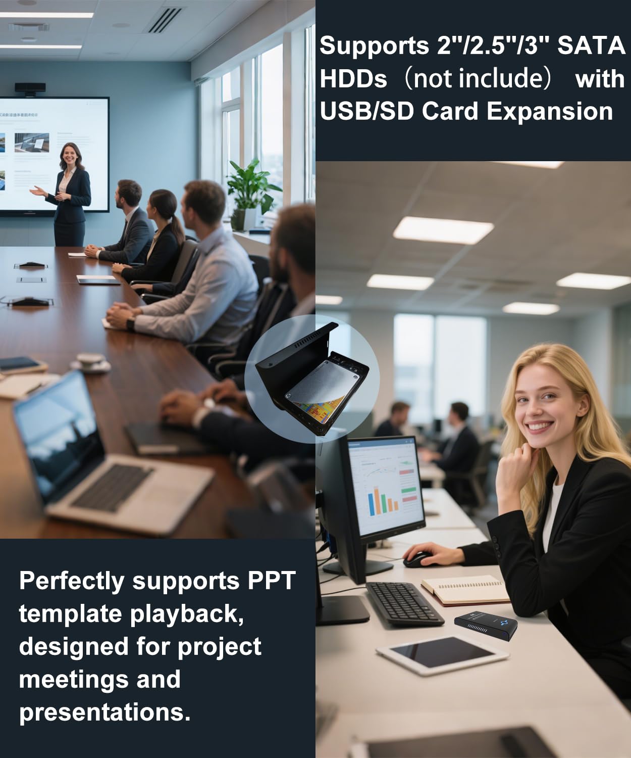 The other big selling point is the integrated hard drive enclosure. That makes it more convenient than a plain media stick or basic box if you already have a drive full of files. The listing also mentions auto playback and resume, which is exactly the kind of feature that matters for digital signage, menu boards, lobby screens, or shop displays. If you need a device that powers up and gets on with the job, that is a real advantage.