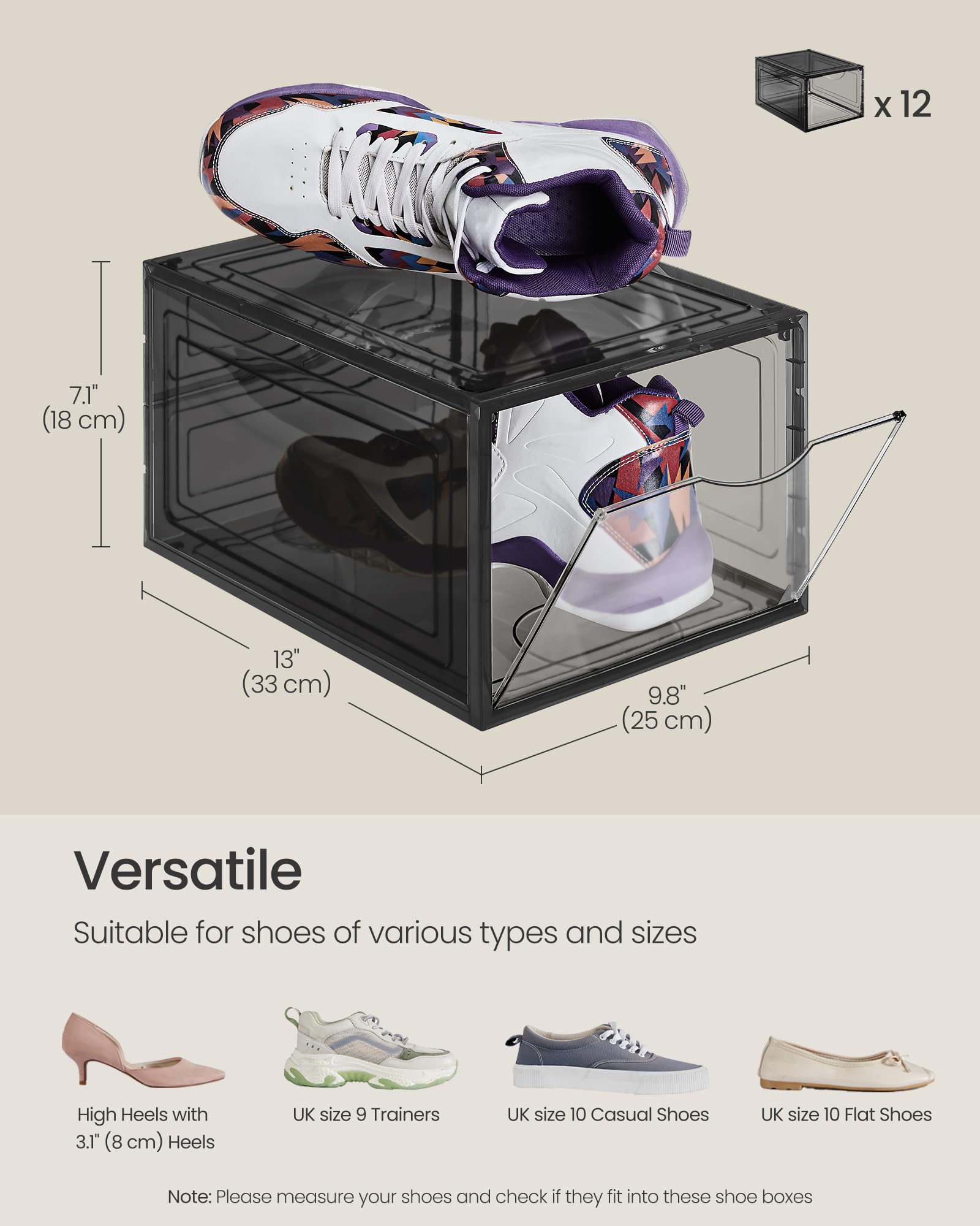 This is a practical storage buy rather than a flashy one. You get 12 plastic shoe boxes with clear front doors, designed to keep shoes visible while stopping them from being scattered around the home. The black finish should suit wardrobes, hallways, or under-bed storage better than bright plastic alternatives, and the fact that the boxes arrive disassembled helps keep the pack compact in transit.