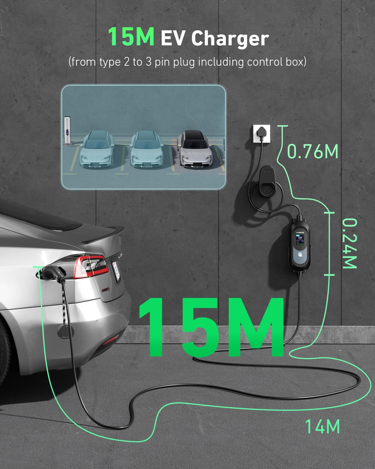- Long 15m cable is more flexible than many portable chargers and helps with difficult parking or socket placement.