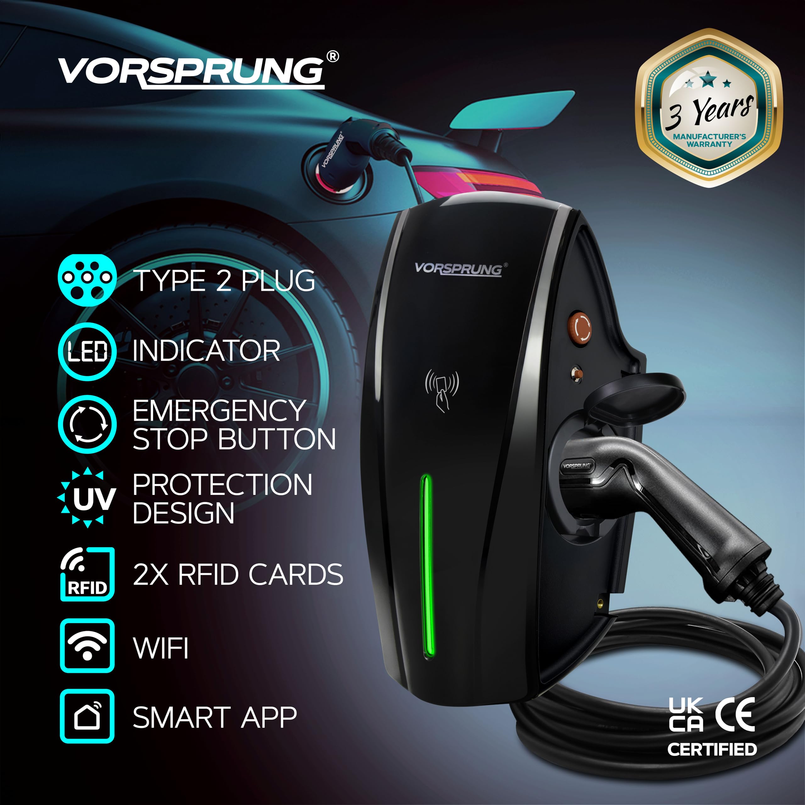The IP65 rating is reassuring for a UK wall-mounted charger exposed to rain and winter weather. The listing also highlights a Soft-Flex UK Winter cable made from TPU, which is designed to stay flexible in rain and sub-zero temperatures rather than stiffening like rival cables. That is a sensible detail for British winters and suggests Vorsprung has paid attention to usability in cold conditions.