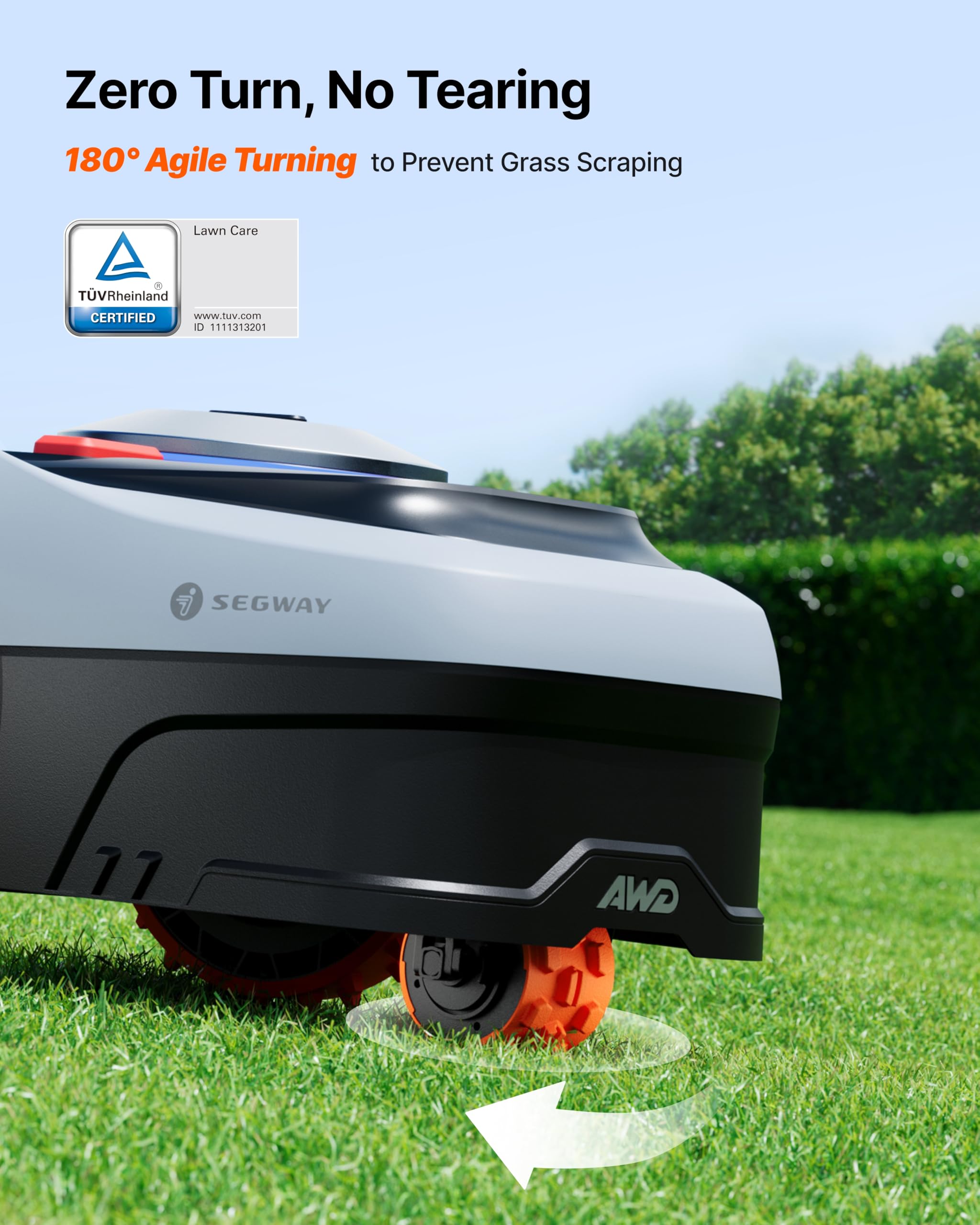 The headline feature is the all-wheel-drive system, which Segway says is designed for rough, uneven or sloped lawns and can handle slopes up to 45%. For UK gardens, that matters: many back lawns have awkward cambers, wet patches, narrow side returns or slightly broken ground, especially after a damp spring or autumn. The zero-turn steering and concentric third-wheel design are also important because they are meant to turn without scraping the grass, which should help on tighter lawns where repeated turning can scar turf.