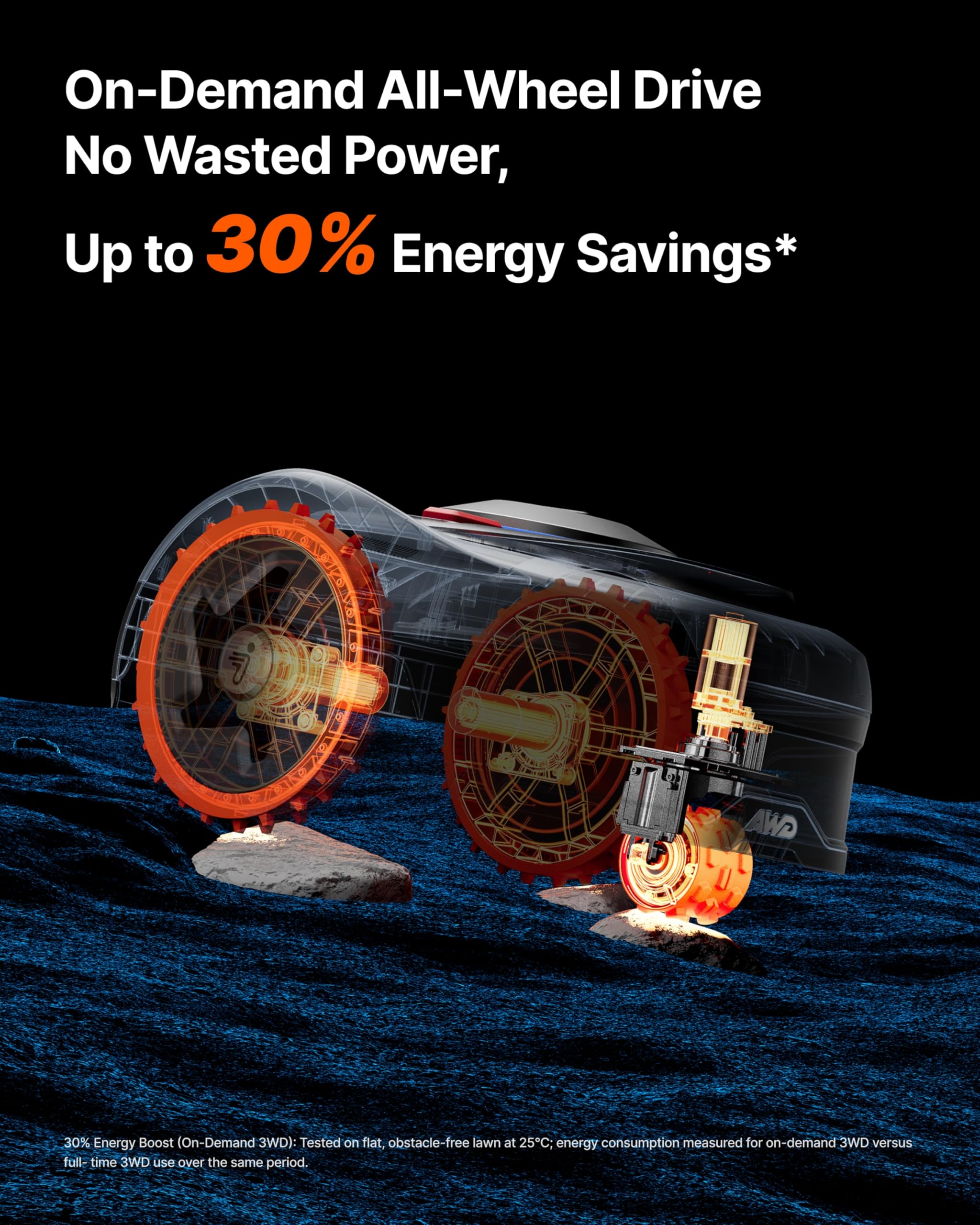 On paper, the performance spec is well judged for a typical UK lawn up to the recommended 500 m². That size suits many suburban gardens, and the hands-free deployment plus multi-zone management suggest it is built for practical everyday use rather than just simple square lawns. The on-demand drive system is claimed to save up to 30% energy by engaging the third motor only when needed, which should help efficiency on flatter sections and reduce unnecessary battery drain.