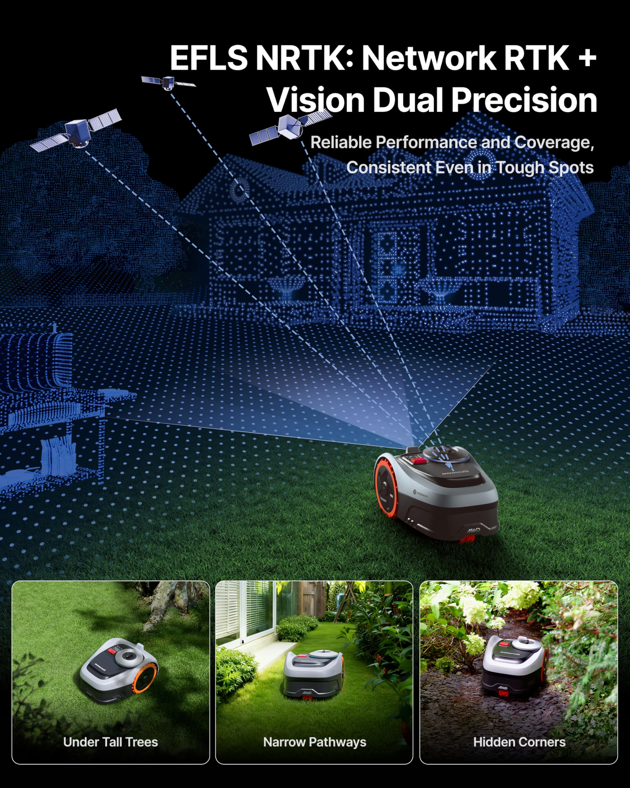 - Boundary-free setup with EFLS Network RTK, vision and one-tap auto mapping removes the hassle of laying a perimeter wire.