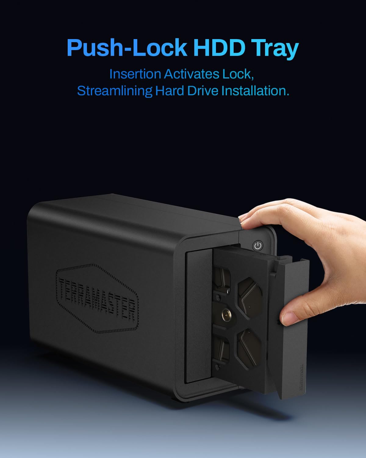 TERRAMASTER positions the F2-425 as a home multimedia hub rather than a heavy-duty business NAS. The spec sheet tells that story clearly: a 2-bay enclosure, Intel x86 quad-core CPU, 4GB of non-ECC SODIMM memory, and 2.5GbE LAN. The promise is simple: enough performance for streaming, backups, and general file serving, with a low noise output of 19dB(A) that should suit a bedroom, lounge, or study. The tool-free Push-Lock design also suggests easy drive installation, which matters if you want a NAS that is less fiddly than many rack-style or enterprise-leaning options.