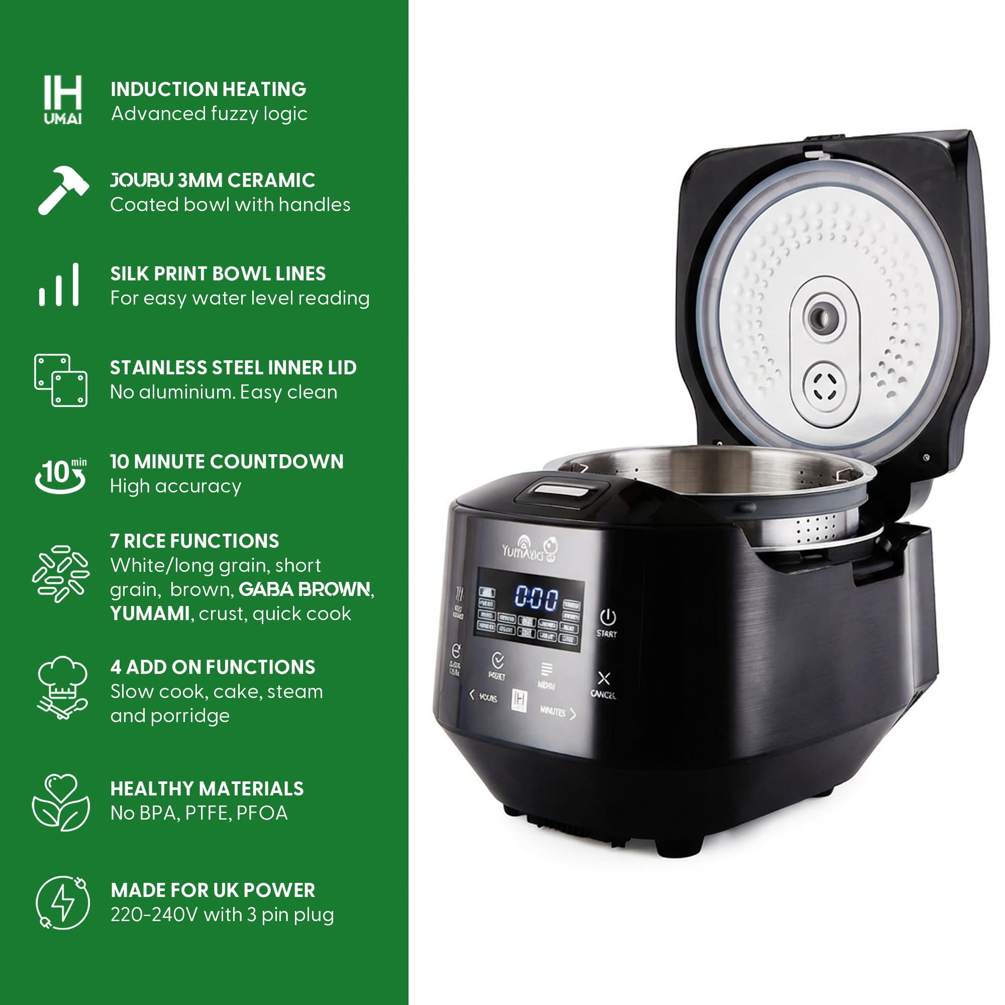 - 7 rice cooking functions include white/long grain, short grain/sushi, brown rice, GABA, and Yumami for more control over texture and flavour.