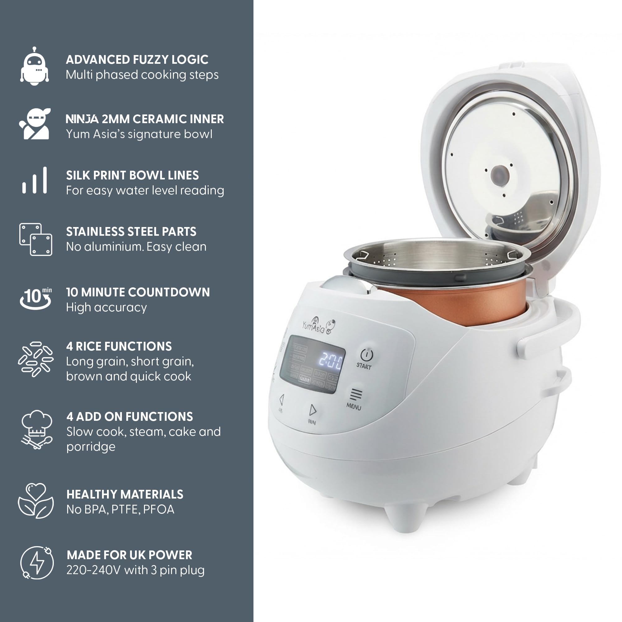 At 0.63 litres and 3.5 cups uncooked capacity, this is clearly aimed at smaller households rather than big family meal prep. Yum Asia positions it for 1–3 people, and that makes sense for UK kitchens where worktop space is tight and a full-size appliance can feel excessive. The Arctic White finish, LED display and “Smart Button” panel give it a neat, modern look rather than the utilitarian vibe of cheaper rice cookers.