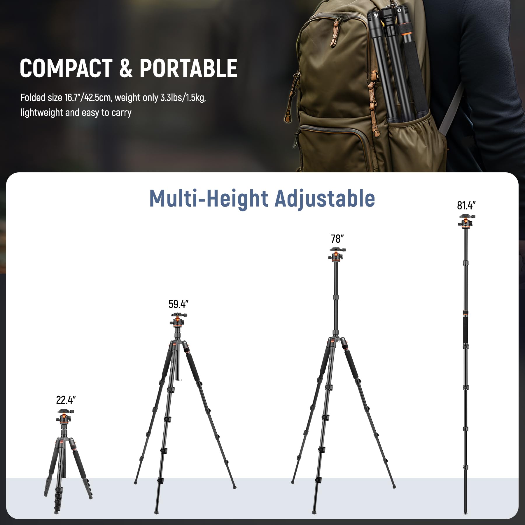 - Tall working range from 22.4"/57 cm to 78.7"/200 cm, plus monopod use up to 81.4"/207 cm, gives strong flexibility for the price.