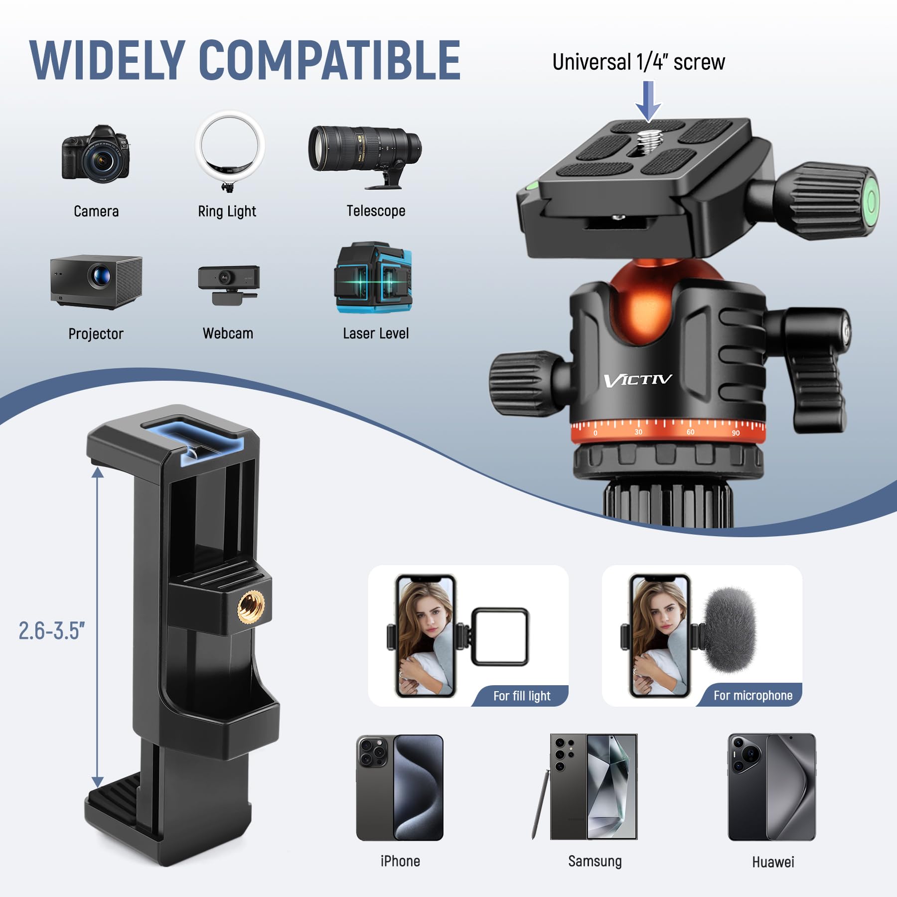 The included 35 mm solid metal ball head is another practical feature. A ball head is the right choice for fast framing changes, and Victiv’s 360° panoramic shooting support should suit users who want smooth adjustment rather than a more rigid, slower setup. The tripod also includes a phone holder, and the compatibility list is broad: the standard 1/4" screw works with Nikon, Canon, Sony, Fuji, smartphones, laser levels, telescopes, projectors, and more.