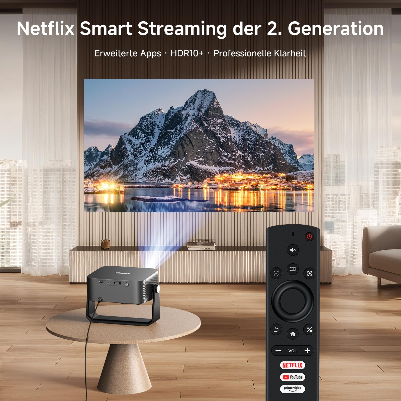 The biggest draw is the built-in Smart Pro OS with apps such as YouTube, Prime Video, and Disney+. That means you can get to content without plugging in an extra device, which is a genuine convenience win for casual viewing and outdoor use. The listing also highlights AI autofocus and automatic keystone correction, so setup should be quicker than on older manual projectors.