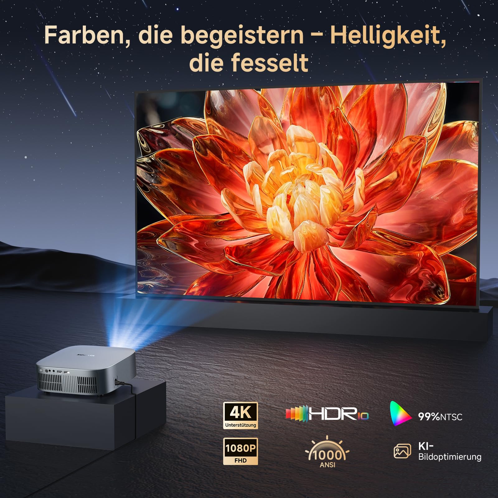 The most important detail is that this is not native 4K. The listing says native 1080P with full 4K support, so buyers should expect Full HD sharpness rather than true 4K resolution. That does not make it a bad projector, but it does matter if you are comparing it with more expensive true-4K models. What you do get is 1200 ANSI brightness, which is a meaningful figure for a projector in this price band, plus HDR10 for better contrast handling in compatible content.