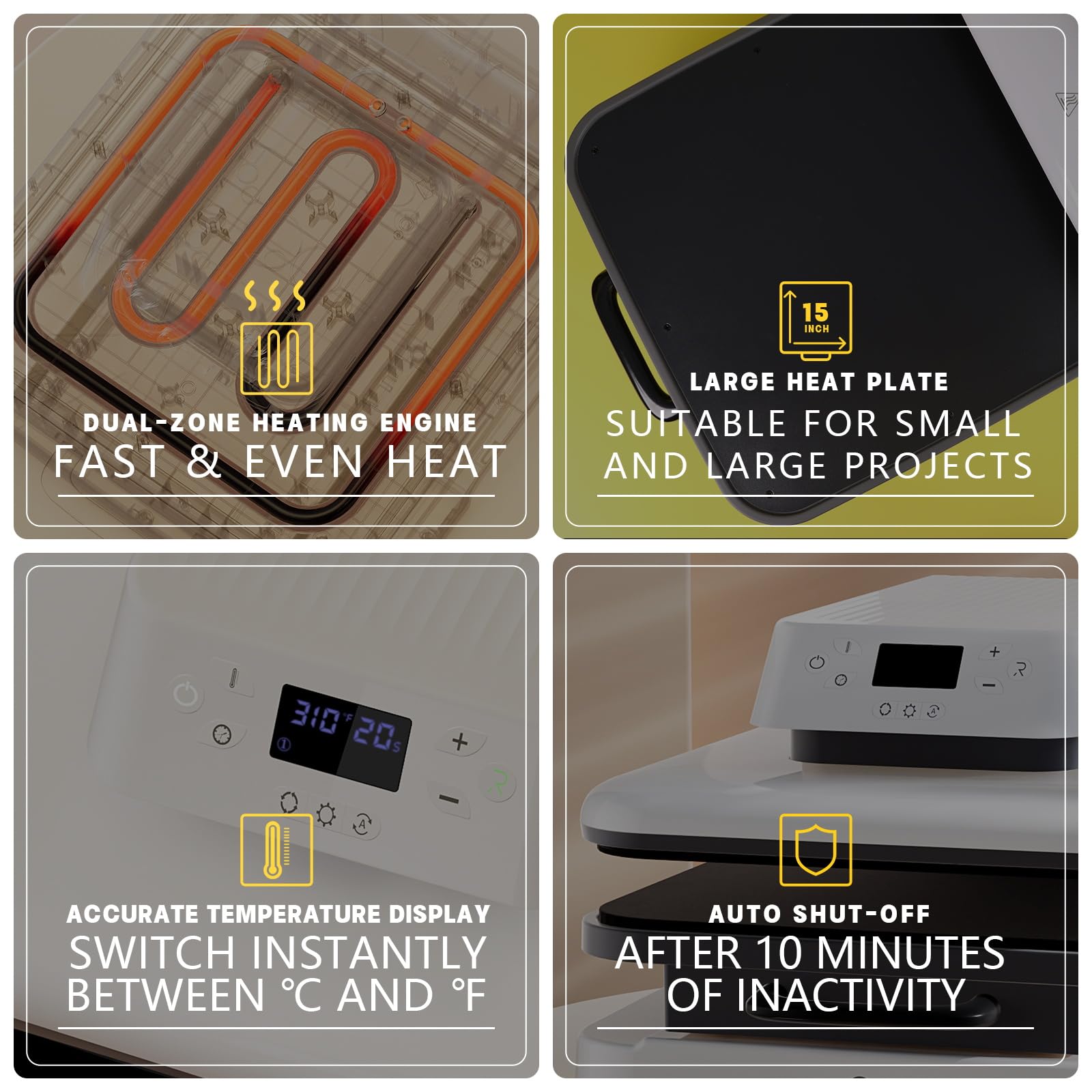 The listing says it can reach 320°F / 160°C in 4 minutes, which it describes as twice as fast as regular heat presses. That makes it a strong fit for batch work or short crafting sessions where waiting around is frustrating.