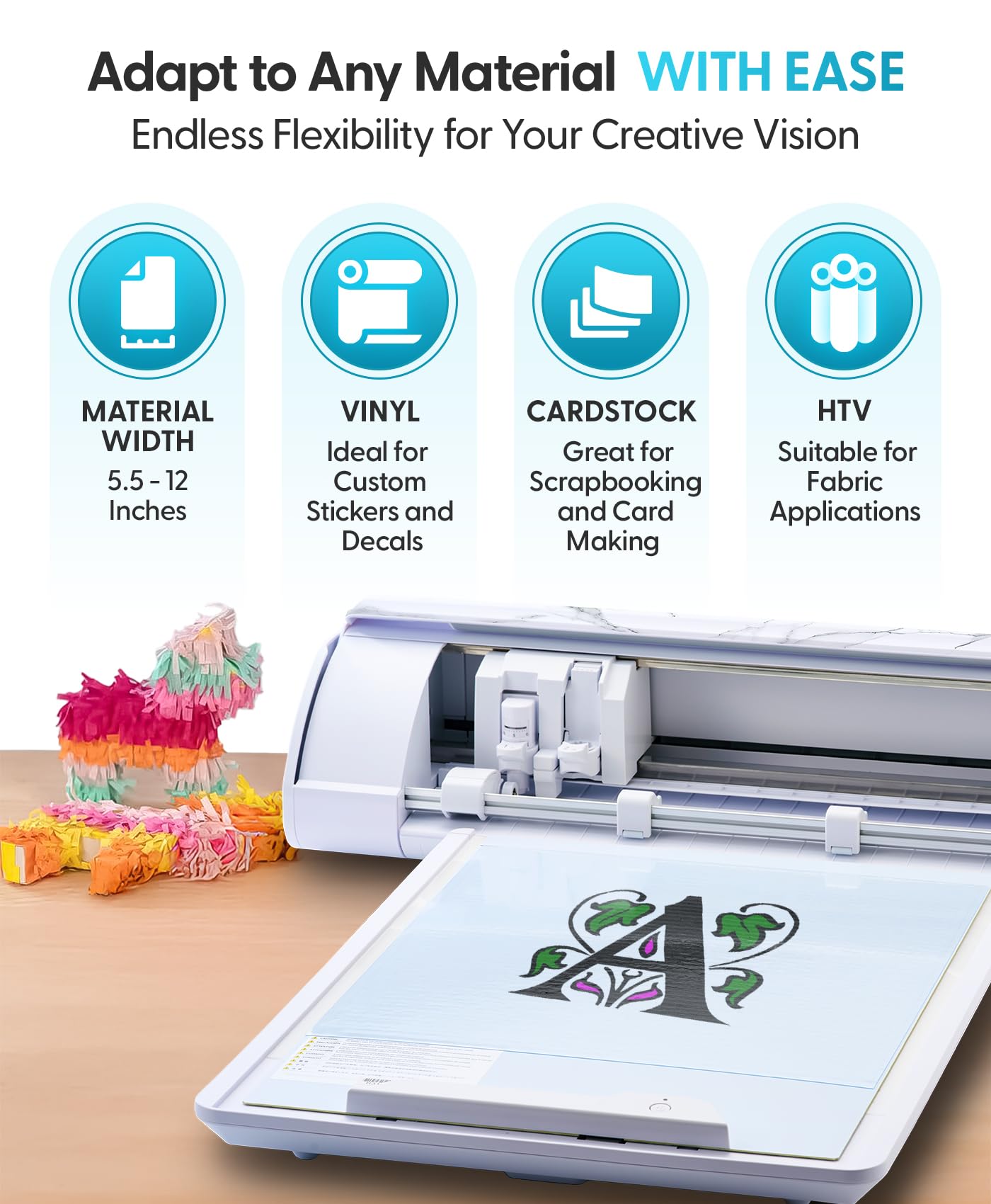It can handle vinyl, cardstock, fabric, and heat transfer materials, with support for materials up to 3mm. That makes it useful for stickers, decals, cards, clothing transfers, and other mixed craft projects. The 4-point registration system also suggests it is designed for accurate print-and-cut work.