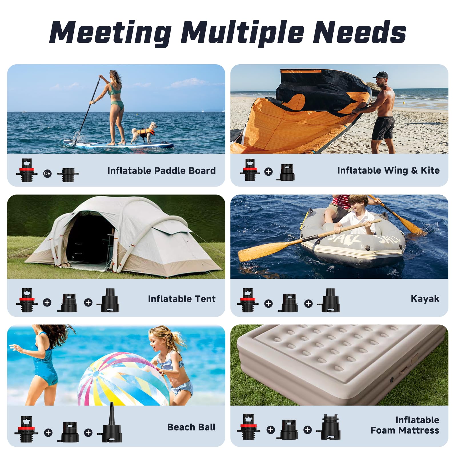 Yes — the listing says it comes with 7 nozzles and is suitable for paddleboards, beds, kayaks, boats, tents, and other inflatable gear. That makes it a flexible option if you want one pump for watersports and camping kit.
