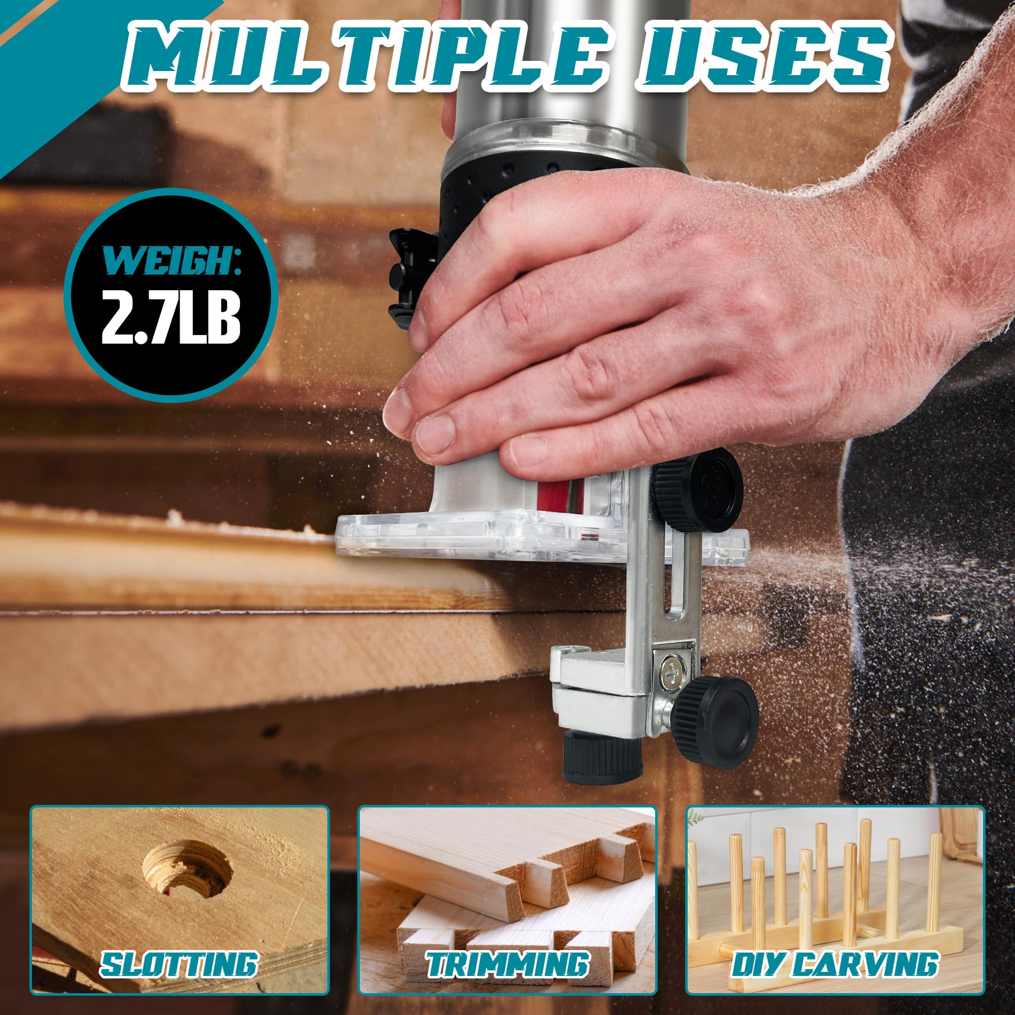 Upon unboxing, the router presents a robust build quality that feels professional yet manageable for hobbyists. Its ergonomic design, combined with a rubber handle, ensures comfort during prolonged use. The transparent base allows for precise visibility, making it easier to navigate intricate tasks. Additionally, the inclusion of 15 assorted 1/4" shank router bits adds significant value, allowing for various wood processing tasks immediately after purchase.